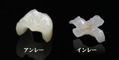アンレー小臼歯、大臼歯(奥歯のこと)の咬頭(とがってる)部分を覆う大きな詰め物。