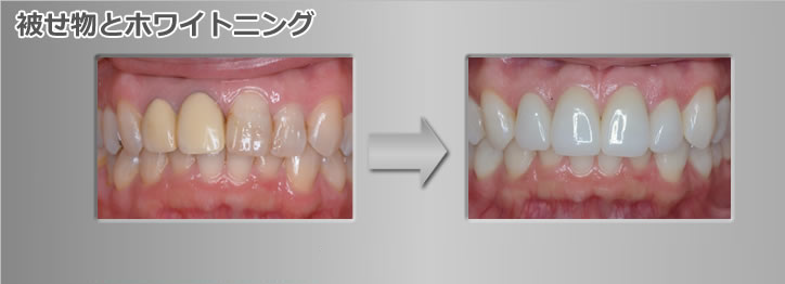 左上の前歯の詰め物・右上、右下の前歯の被せ物・右下の前歯の歯肉ステインも除去してます。他の歯はホワイトニング。