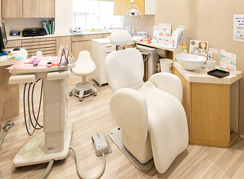 保険の治療ゾーン、保険のメンテナンスゾーン、自費治療ゾーン、カウンセリングルーム、アクティビティルーム、受付、外観、技工室、消毒室、廊下、エレベーター、研修施設、つくしんぼ保育園、待合のウォーターサーバー、コーヒーマシーン、マッサージチェア、ポータブルユニット(カレンちゃん)、福祉車両の訪問車(VOXY)、ポータブルレントゲン装置
