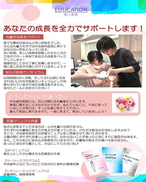 中央歯科医院にはさまざまな部署があり、それぞれにスペシャリストがいます。先輩はみんな指導熱心ですので、さまざまな技術について学べることと思います。また、当院にはマニュアルが完備されており、マニュアルに沿って勉強・練習をすれば、だれでも一流の歯科衛生士になれるよう、教育カリキュラムが組まれています。
