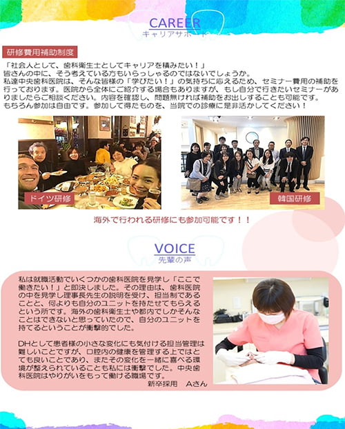 マニュアルと練習環境も整っているため、その日に出来なかった事をその日に復習することもできます。また、中央歯科医院にはさまざまな年代の歯科衛生士が在籍しているため、プライベートなことも相談していただけます。