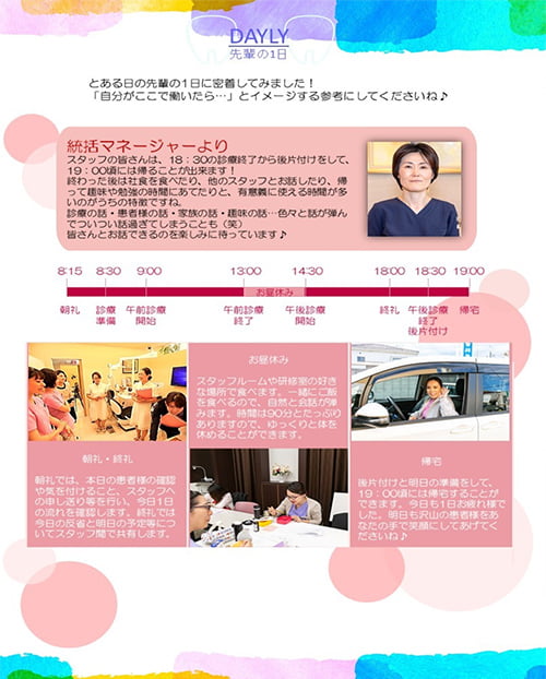 私は就職活動でいくつかの歯科医院を見学し、「ここで働きたい!」と即決しました。その理由は、歯科医院の中を見学し理事長先生の説明を受け、担当制であることと、何よりも自分のユニットを持たせてもらえるという所です。海外の歯科衛生士や都内でしかそんなことはできないと思っていたので自分のユニットを持てるということが衝撃的でした。