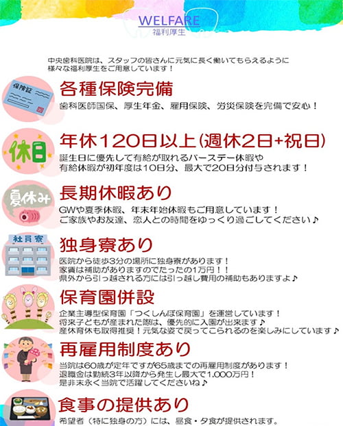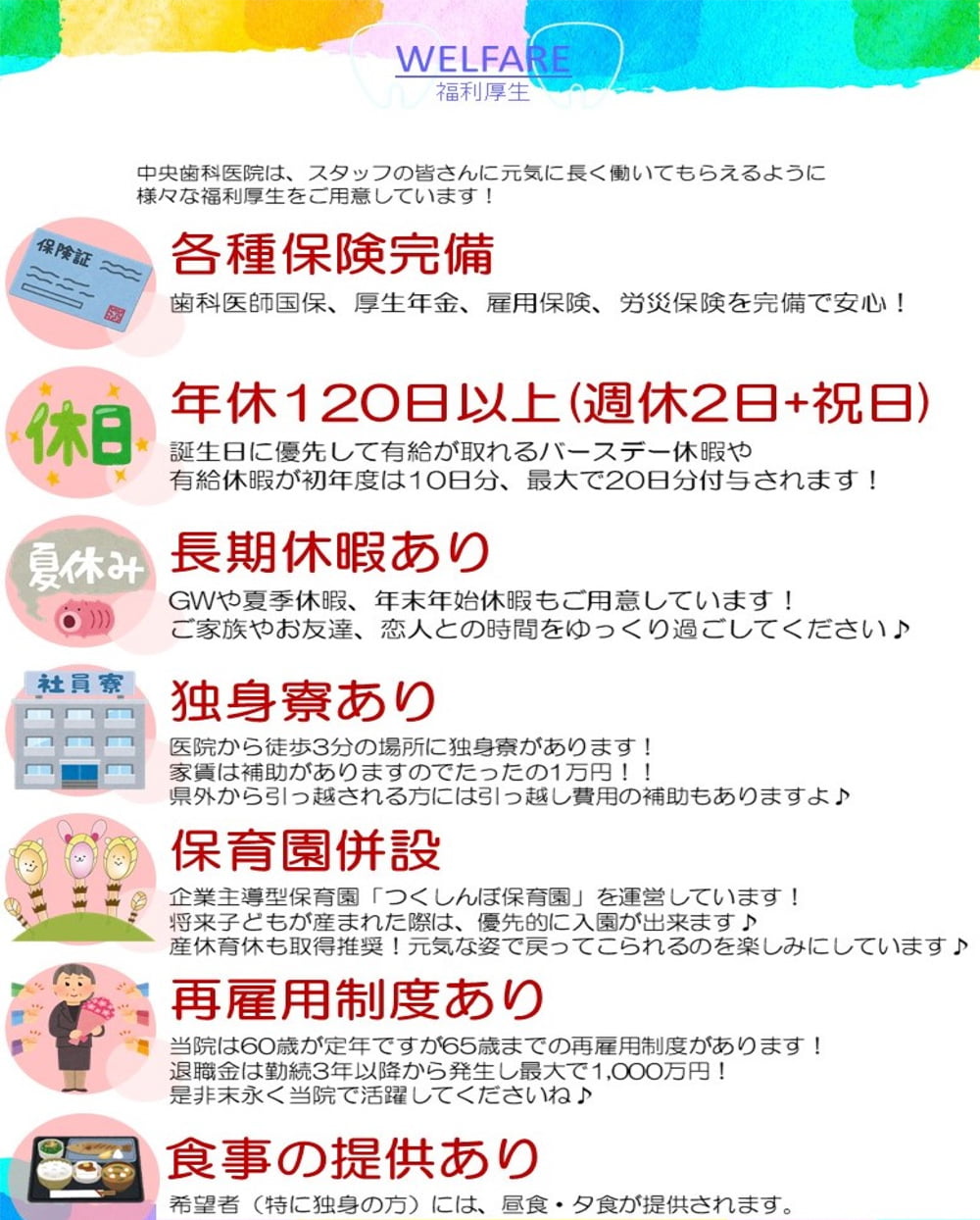 雇用保険、労災保険、歯科医師国保、厚生年金 制服貸与、交通費支給、駐車場手当、退職金制度(勤続3年以上) 等 |