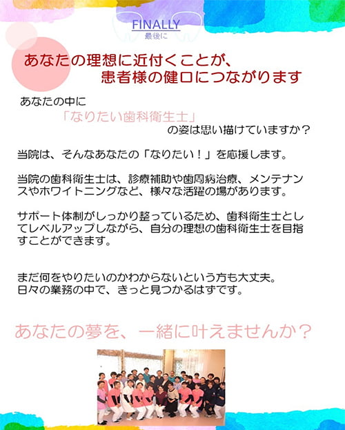 | 仕事内容 | 歯科衛生士業務(診療補助・TBI・歯周予防・ホワイトニング 等) |