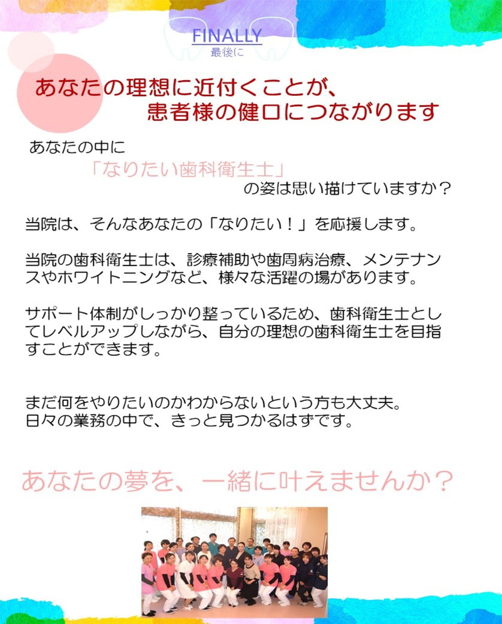 中央歯科医院には、たくさんの魅力があります。歯科衛生士本来の業務に集中できる環境が整っていますし、新しいことを勉強して、それを患者様に還元するシステムもあります。患者様担当制を取っているため、患者様と長くお付き合いができ、口腔内の状態を管理できる、というのも、歯科衛生士としては魅力的です。担当制のおかげで、患者様と信頼関係をしっかりと築くことができるため、責任感とやりがいを感じながら仕事をすることができます。また、いろいろなジャンルの治療ができるため、患者様にも選択肢を広く持っていただけます。そして最大の魅力は、自分達が向かう方向を指示してくださる理事長がいることだと思います。 -