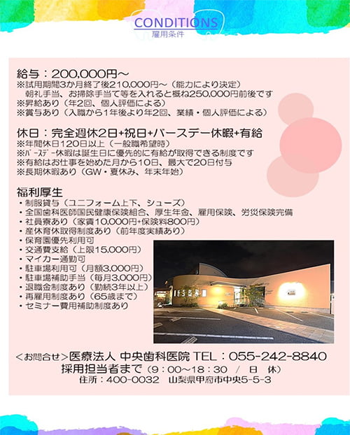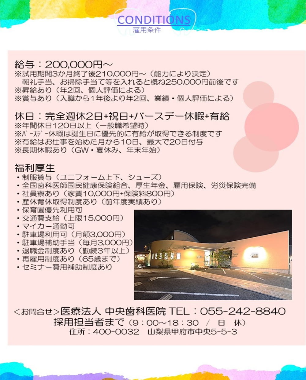 | 勤務地 | 中央歯科医院(山梨県甲府市中央5-5-3) |